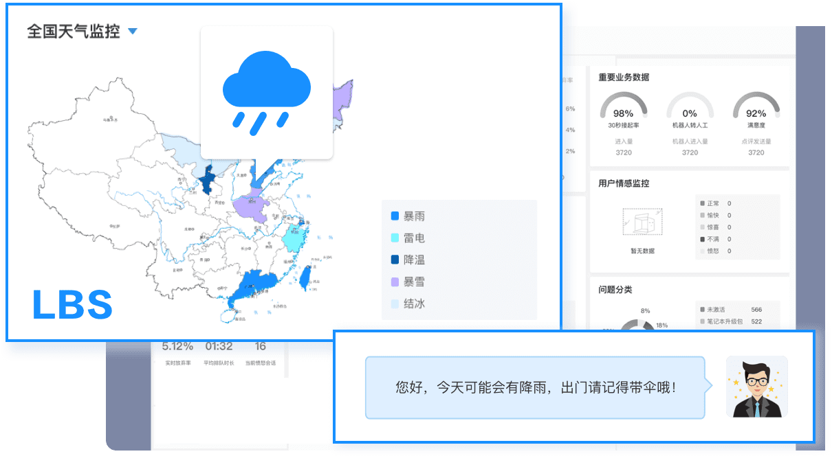 魔方系统实现了各地天气的识别,可以根据用户归属地展示当前咨询用户天气情况,遇到阴雨,雷暴等恶劣天气,客服人员可以给客户出门带伞,注意安全等温馨提示,一切以客户为中心,将用户关怀做到极致,极大提升客户满意度。